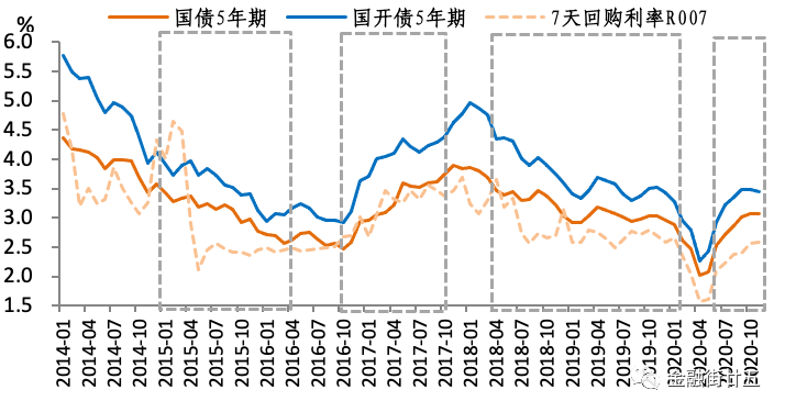 1.作为债券市场的基准利率,国债和国开债5年期收益率走势未直接因信用违约潮的影响而改变当期趋势,主要是受央行货币政策的指引。鉴于货币市场7天质押式回购利率最能体现我国货币政策的松紧程度,通过观察发现,在违约潮中,国债和国开债收益率的走势与7天回购利率走向基本具有高度的一致性,意味着债券市场的基准利率走向主要受央行货币政策的引导。