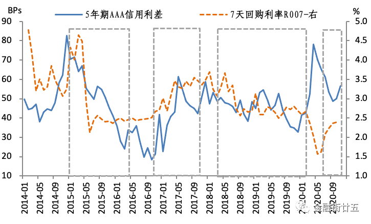 1.违约潮中,AAA级信用债相对国开债的信用利差走势基本跟随利率债,与货币政策高度相关。在货币宽松期,AAA级信用利差明显收窄,主要因资金充裕,市场缺资产,会增加信用债的配置力度,以提高资产收益率,从而使信用债收益率的降幅大于利率债。反之,在货币紧缩期,信用利差明显拓宽。