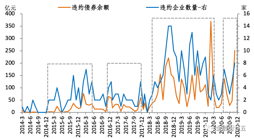 自2014年3月“11超日债”成为我国首单违约债券以来,我国债券市场先后经历了四轮违约潮,如图1所示。