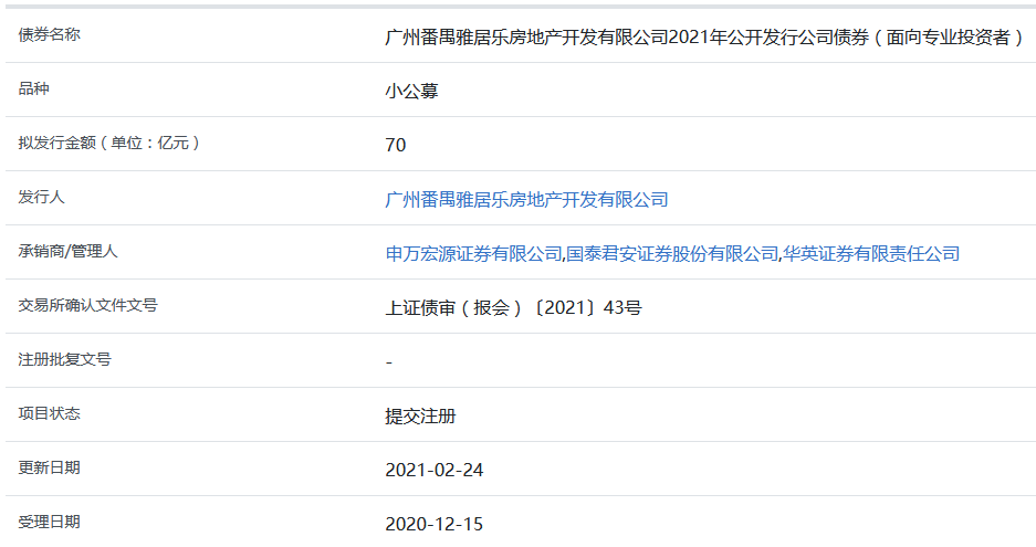 2月24日,据上交所消息,广州番禺雅居乐房地产开发有限公司2021年公开发行公司债券(面向专业投资者)在上交所提交注册。